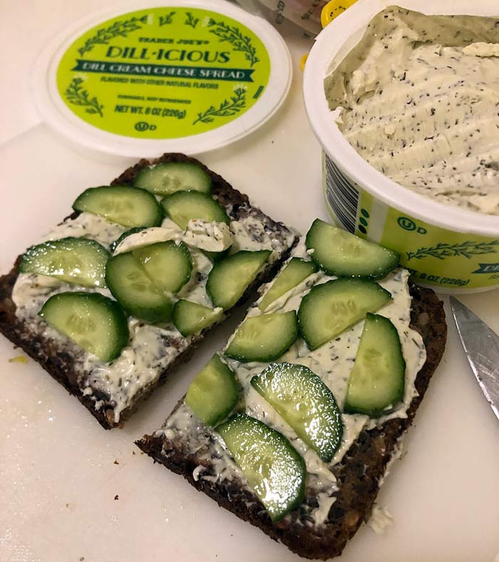 It also tasted great simply spread on a few crackers I tried it with. I then spread it on TJ’s yummy Euro Grains Bread which I topped with slices of cucumber. This combo was excellent. Try it on that wonderful bread or crispbread.