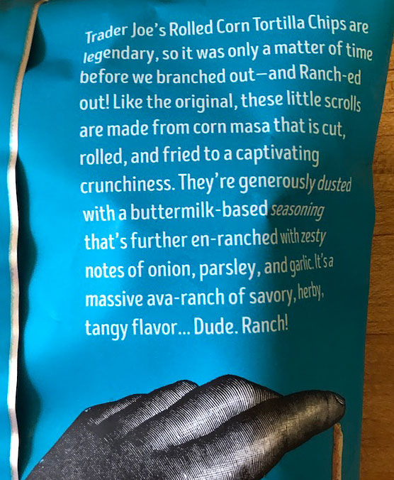 The story is I was at Trader Joe’s, looking for the new Ranch flavor rolled tortilla chips and could not find any. So I asked one of the employees if they had any in back. He went and found what he said were the “last two bags”.