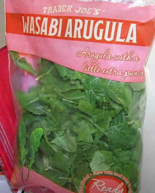 It would seem the taste-makers at Trader Joe’s have a real thing for Wasabi. They have Wasabi Mayo, Wasabi Roasted Seaweed Snacks, among others… and this latest new product,“WASABI ARUGULA”. This is somethng pretty new I saw in the Produce section (at least in my area, NYC). As it says on the package this is “Arugula with a little extra punch”. Its does have a very nice spicy bite to it (and no, there is no “wasabi” in it, its a natural thing). It’s very good. I love this stuff! As I said, It doesnt have wasabi added to it, its just what they are calling a “spicier” variety of arugula, more than the “Wild Arugula” they have sell.