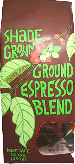 Every day after I wake up, I jump in the shower and start thinking about making my morning “Cap” (cappuccino that is) in my (budget) espresso machine. I might not get out of bed otherwise. If you are one of these “coffee freak” types as well you may own as I do, some kind of Espresso Machine, the manual kind where you put ground coffee into to make your own espresso otherwise known as “pulling a shot”. Just saying the “Keurig or pod” coffee people are not as DIY as us manual espresso owners, who get our hands dirty and grind coffee beans and tamp them into a portafilter to brew and espresso drink. So if you make yourself espresso drinks at home in some type of machine that you put ground coffee in obviously the most important thing is starting with very good coffee for making Espresso, naturally. Generally I buy whole espresso roast beans. I usually buy coffee (here in NYC) at Whole Foods, Fairway or Zabars or Porto Rico Imports, and grind the beans myself every other day or so, so its always pretty freshly ground. This is ideal. If I was less lazy I’d grind coffee every day just before I made every cup, which would be better still. The instant you grind coffee beans up the coffee is at peak flavo. It starts to lose a bit of its flavor and aroma in the next hour or so. So I usually don’t buy ground coffee. Still I saw this bag of ground espresso on the TJ “new product” shelf a few months back and thought I’d try it, even though its already ground into an espresso grind. Its called TRADER JOE’S “SHADE GROWN GROUND ESPRESSO BLEND”.