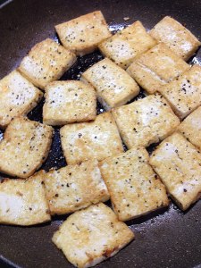 2. Cut the tofu carefully. First into slices about 1/2 inch thick, then if you want smaller pieces, cut those into half. Heat up a non-stick or cast iron pan till it is good and hot with a teaspoon or two of vegetable oil and add the tofu slices (a little sesame oil added now is great for extra flavor). Let it cook for about 10 minutes at medium heat until the tofu looks golden brown when you check it. Flip the slices over and cook the other side till also golden brown. In the picture below I’ve sprinkled on some fresh ground black pepper too.