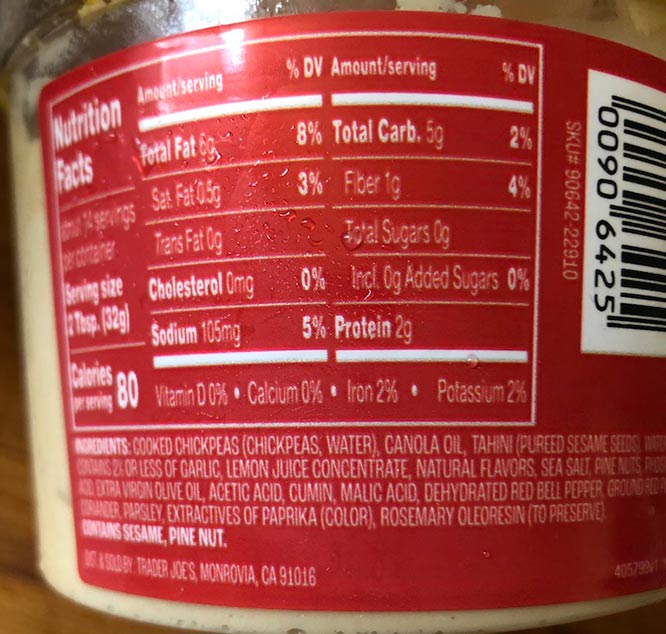 UPDATE SUMMER 2025: Trader Joe’s changed this product. It’s in a new package for one thing and for another thing it seems to have changed the ingredients in that new label has tahini as third ingredient listed after canola oil. It was previously listed as second ingredient. So there is less tahini now. I have been getting the ORGANIC HUMMUS (it does cost a bit more)