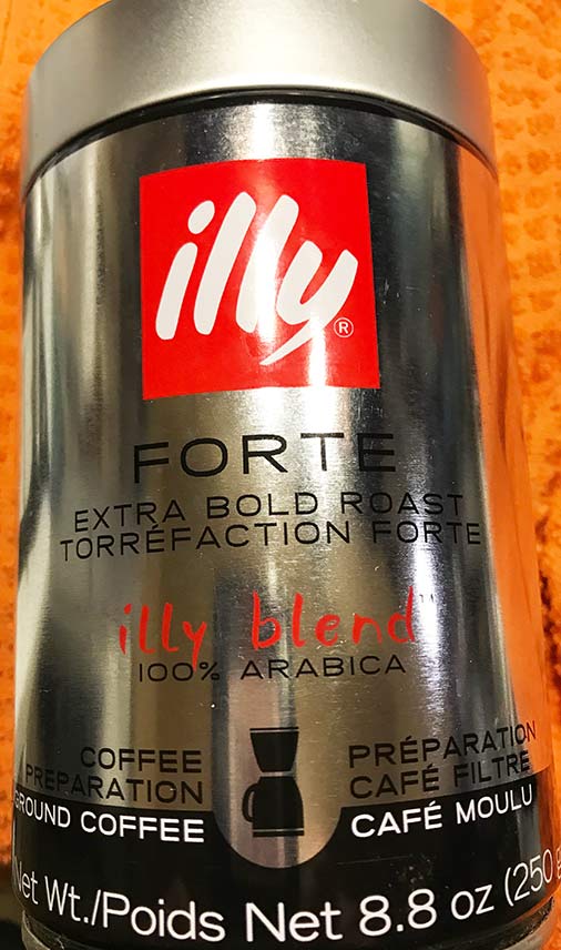 I was surprised the first time I saw the famous red ILLY logo staring at me from the coffees shelf at Trader Joe’s. Really? Trader Joe’s is now selling ILLY coffee?!? Yes it is and let’s hope it stays that way. ILLY is one of the most famous coffee brands worldwide and in Italy for 80 years on. Their red logo is instantly recognizable around the globe. The ILLY coffee company has a long history. They produce terrific coffee. I think one only finds this premium brand at some special stores and not at the supermarket. So yes I was happily surprised to find I can buy it and TJ’s now and for a decent price too ($9.99 for 8.8 oz). This is a very good coffee, a blend of 9 different Arabica origin beans in a medium dark roast in a medium fine grind. It should be good for most any coffee maker, in an espresso machine, for a Moka pot (which is what I have switched to), doing drip or pour over coffee and great if you like strong dark roasts. I use this for a Cafe Con Leche (with milk) done in a Moka pot and its perfect for that.