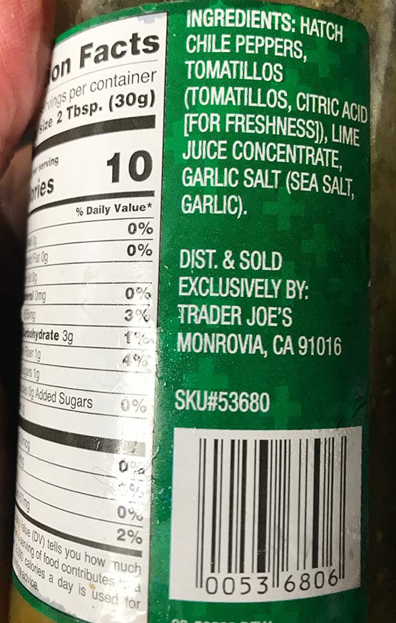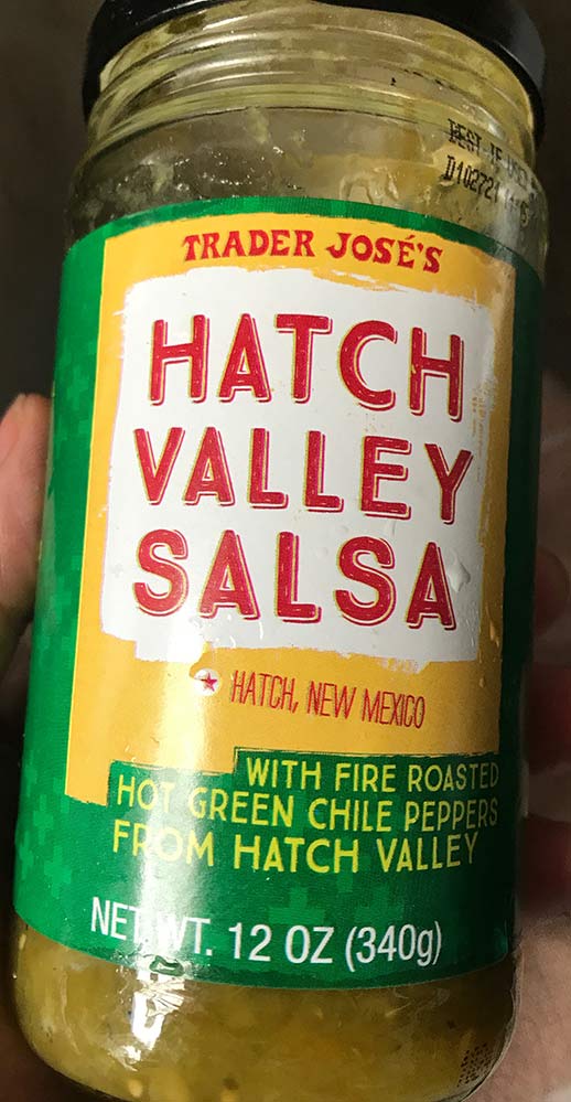TJ’s HATCH GREEN AND RED CHILE FLAKES are terrific and apparently a hit and a popular Trader Joe’s item. When I saw this “Trader Jose’s Hatch Valley Salsa” with “fire roasted Hatch Chile peppers” I guess I was expecting it to have a special taste but in fact found it to be just OK, nothing special at all. Trader Joe’s has had a GREEN SALSA (Salsa Verde) for some time which is fine in this salsa verde style and but which is cheaper at $1.99. This one is $2.99, a premium price. Both have green chiles and tomatillos. On its own this Hatch Valley Salsa was again just OK when we ate it with TJ’s Corn Dipper chips, it didn’t bring a great deal of flavor plus as it is thin and not great for dipping (on the plus side of that, no thickener agents) I haven’t tried this and the regular Green Salsa together to compare them side by side but still, I probably won’t buy this again as I just don’t think the higher price is worth it against the Salsa Verde. It might however be good for cooking a dish like Green Chile Enchiladas. TJ’s has so many very good salsa’s and related products (like Cowboy Caviar which I love as well as the Chlpotle Black Bean Dip) So I am giving this HATCH SALSA a “Meh” as its $2.99. Medium spice heat level. Ingredients: Hatch Chile Pepper, Tomatillos, Lime Juice Concentrate, Garlic Salt.