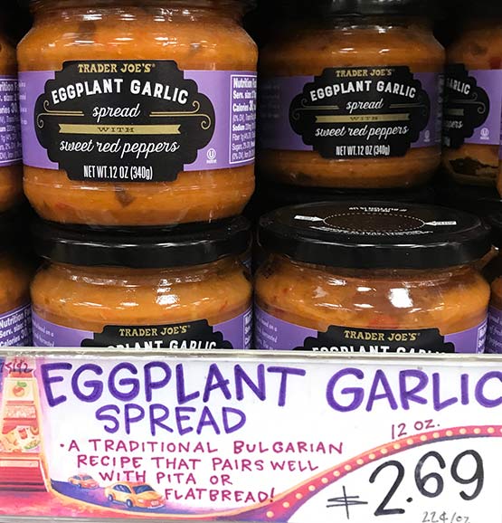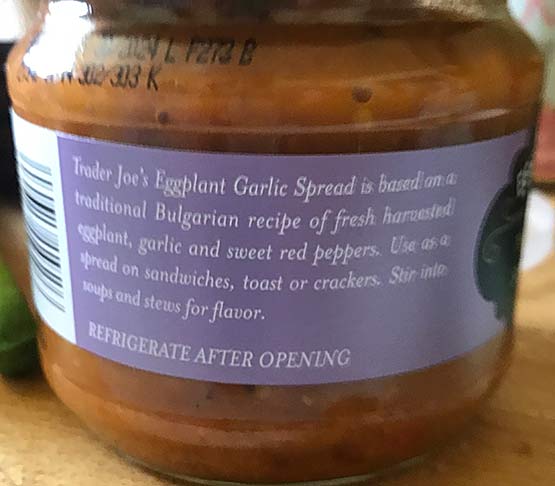 This spread, which is made in Bulgaria, is absolutely delicious. I tried this (vegetarian) spread as a dip served with some warm flatbread – a combo made in heaven. I can easily see this used in other ways besides being just a dip or spread. You could serve this on top, or on the side of say grilled chicken or fish. Or pasta. Add a few spoons to your pasta dish (or gnocchi or polenta) along with lots of garlic and olive oil. Inside an omelet? Sure. Now as yummy as it is, personally I would like more garlic. I have a feeling if your (Bulgarian) grandma made this spread it might actually have enough garlic in it to kill vampires. My late Jewish grandma (Romanian by birth) made a delicious roasted eggplant spread that had a ton – and I mean a ton – of garlic in it and it was fantastic. So just to see if more garlic would be a good addition with this spread, I mashed up a few cloves of garlic, mixed it in and let it sit for an hour to develop. OMG, it was now even better, if you love garlic of course. So I suggest doing this and adding a slug of good olive oil too. If you do this, the spread tastes homemade! However even just out of the jar, this spread is delicious, kind of an “Eggplant Caviar”. This spread is something I can easily see putting out for guests who suddenly showed up, along with some crackers, which would take all of 2 minutes of work, and would look impressive and have them asking you “yum, this dip is delicious; did you make it?”. If you put a few cloves of garlic in it, I would tell them with a straight face, yes I did. Its $2.69 for a 12 oz jar. Serve with warm pita or naan, or flatbread or toast or crackers…..
