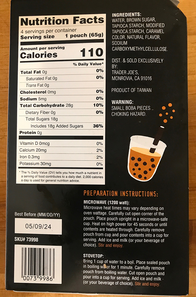 Trader Joe’s BOBA TEA kit is a (poor) approximation of what you might get from a specialty Boba Tea shop. I have had Boba Tea from quite a few different Tea shops and in short, Trader Joe’s Boba Tea Kit won’t put any of them out of business. The drink you get in a real Boba Tea shop is way better than this, however if you’ve never had it before this may give you an idea of what “boba tea” is. As my wife commented “this is a Trader Joe’s version”. She meant it as a knock as in “cheap knockoff of the real thing”. A specialty shop boba tea drink usually costs about $5-6 bucks each. This kit sells for $5.50 for 4 drinks. So yes a cheap knock off. Granted, its a high profit item (sugar, tea, tapioca)