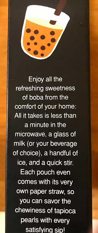 Anyway if you can’t have it at one of these shops and just want to try boba tea in that case then his might be a good starting point. For one thing the tapioca pearls in Trader Joe’s are much smaller than the ones that the shops make which are huge and so chewy. This kit has 4 pouches of a concentrate with the pearls. You mix this package up with milk or tea (or combo of the two) plus a handful of ice to dilute its sweetness, and you need to add enough of these things in, otherwise it will be way too sweet. I put the defrosted pouch into a glass jar with a lid so I could really shake it up with the added ice and liquid. The kit even has 4 big straws. Not bad, but again really no comparison to a Boba Tea shop drink. I probably wouldn’t buy it again.