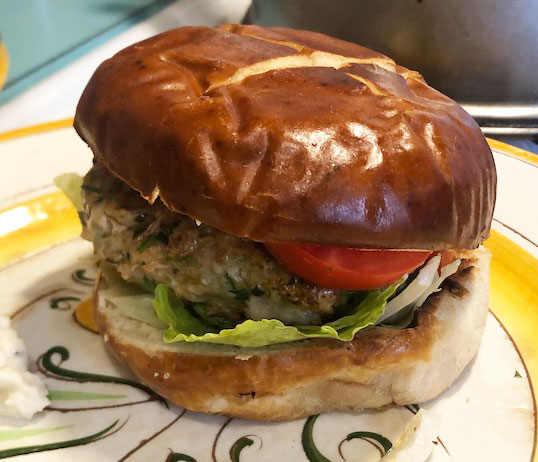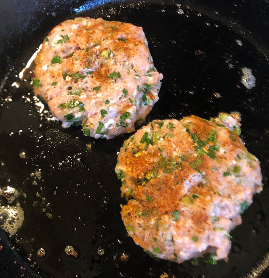 If its not frozen, you can add ingredients in, mix it up and form your own burgers. If I add say a few spoons of chopped fresh parsley and spices, mix it all in, form a burger (which is usually a little smaller and thicker than the way they come frozen). This way they not only have way more taste to them, they also conform to the hamburger buns which can be smaller than the diameter of the frozen pucks. Here are turkey burgers with chopped parsley added plus a bit of chopped pickled sweet jalapenos. And yes you want to add oil and/or butter when you cook these turkey burgers which don’t have that much fat.