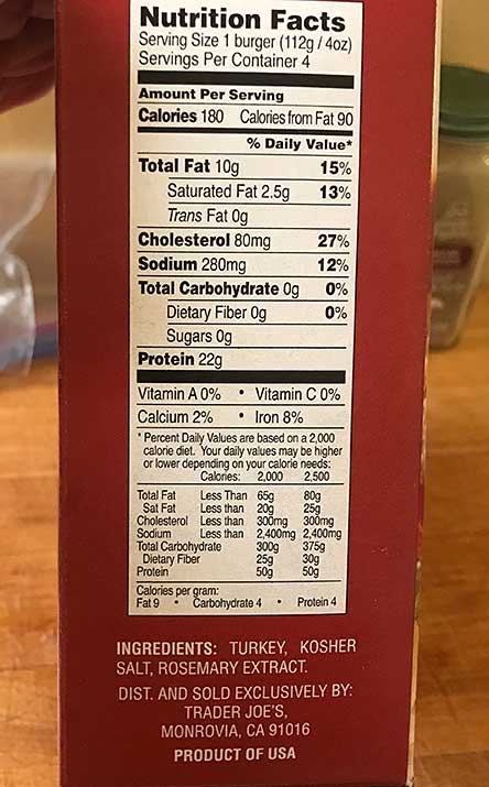 However I can see a few reasons some people might like frozen turkey burgers instead of buying fresh ground turkey. For one thing I imagine some folks (especially singles?) might find this more convenient. Say you just wanted one burger for dinner. You have that ready to go and are not left with extra turkey which you would have to use in a few days, or freeze for later use. Maybe some people don’t like touching ground meat and forming burgers, or just find this an easier option? Certainly one benefit of these frozen turkey burgers is the frozen burgers are a bit cheaper than fresh ground turkey. These go for $3.49 3.99 for a pound (4 x 1/4 lb). One pound of TJ’s fresh ground turkey will cost you $3.99 4.49 presently. So the frozen ones are a wee bit cheaper.
