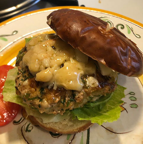 Our turkey burgers were yummy with toasted buns, lettuce and tomato and we quite enjoyed them and kind of could not tell they were turkey burger and not ground beef. The trick again is really seasoning these as if you don’t it will be very bland tasting. And melted cheese never hurts! By the way, the buns I used here are the PRETZEL BUNS, perfect for burgers and many other things.