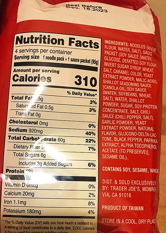 - 920 mg SODIUM (Note: That is nearly 1/2 the recommended amount a person should eat in a day. As some packaged Asian foods have very high Sodium levels be sure to check the label when shopping for them).