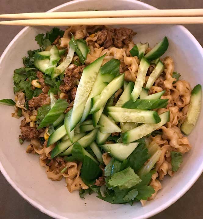 I plated the noodle dish, tossing on some chopped scallions, cilantro, sliced cucumber. Drizzled on a bit of Toasted Sesame Oil. Wow, this noodle dish was so much better it wasn’t funny. These noodles now tasted good! Here’s the dish (and yes I know I should have cut the cucumbers way thinner!)