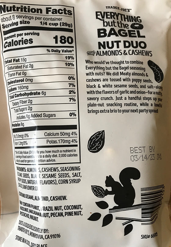 “Meaty almonds and cashes are tossed with poppy seeds, black and white sesame seeds and salt along with the flavors of garlic and onion for a nutty savory crunch”