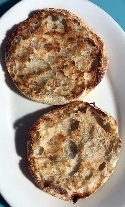 I buy Trader Joe’s “English muffins” all the time. I just love these for breakfast, plus. They come in two versions, the regular classic one and a whole wheat version. Both are good versions of a classic English muffin with lots of nooks and crannies. They come already partially “fork split”. Just use your fingers or a fork to complete the job and gently open the muffins slowly. You want as many nooks and crannies as possible. Never ever cut a muffin open with a knife as you get a flat surface with no crannies.