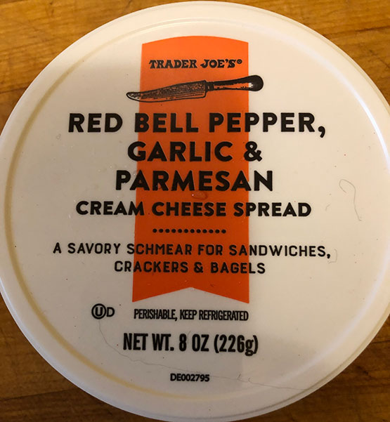 “Our newest Cream Cheese Spread is celebratory, creamy, super savory, and full of flavor for all your summer schmearing needs. Trader Joe’s Red Bell Pepper, Garlic & Parmesan Cream Cheese Spread is a zesty combo with a heavy-handed sprinkle of Parmesan cheese, is flecked with red bell pepper, and studded with minced garlic throughout.”