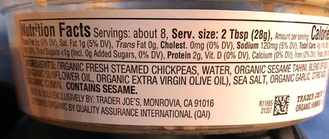 INGREDIENTS: Organic fresh steamed chickpeas, water, organic sesame tahini, blend of oils, sea salt, organic garlic, citric acid, organic cumin