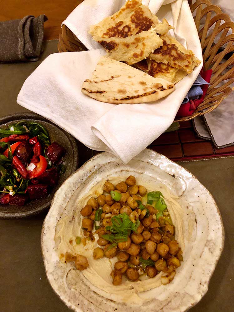 While fine as is, I do like to add a little squeeze of fresh lemon to my tub and mix it in well. Serving it, a drizzle of very good EVOO over the top. Serve with with some warm pita or lavash and a salad. Yes.