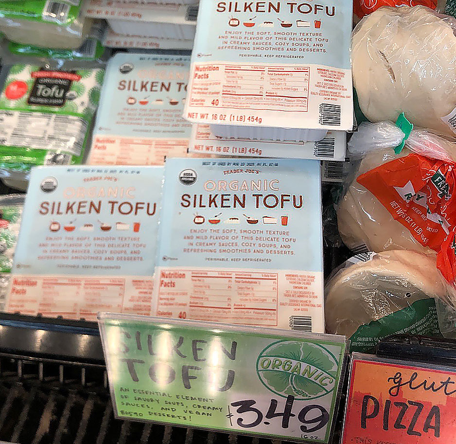 TJ’s says: “…(Silken Tofu) can be enjoyed hot or cold, mixed into sauces, and even blended into smoothies. From the simple (lightly boiled, topped with Crunchy Chili Onion, and enjoyed by the spoonful) to the slightly more involved (mixed with Turmeric and Nutritional Yeast and fried like scrambled eggs), Trader Joe’s Organic Silken Tofu is a versatile, velvety-textured addition to your culinary toolbox.”