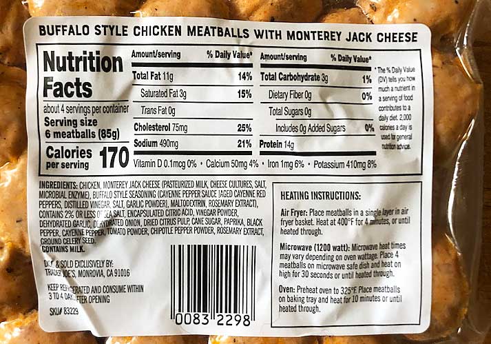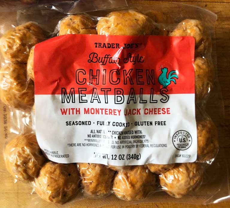 I think Trader Joe’s chicken meatballs are a popular item for them. I usually notice people going for packages of them. I just noticed this new one. With this new version Trader Joe’s has three versions, the original one, a Teriyaki one, and this new version which is “Buffalo Style with Monterey Jack cheese”.