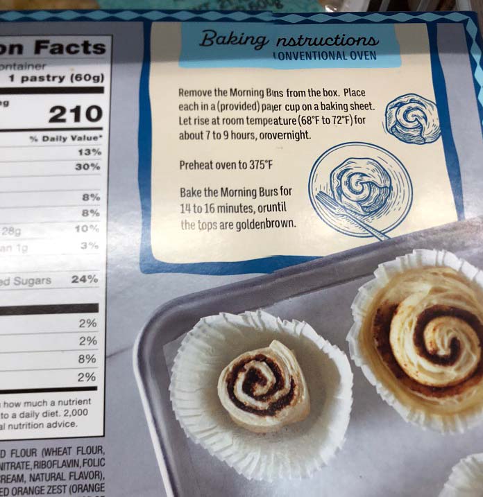 The prep is a bit similar to Trader Joe’s excellent CHOCOLATE CROISSANTS. Meaning the night before you take them out and let them proof overnight (or 7-9 hours) at room temperature before baking them for approximately 15 minutes at 375. I haven’t had a chance to try them yet myself but they seem promising based on how good the same type of laminated dough used in the chocolate croissants is.