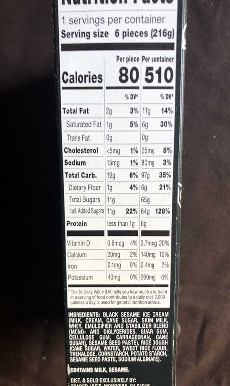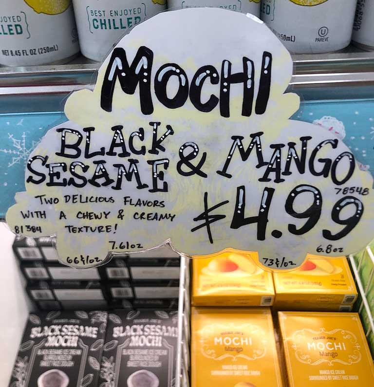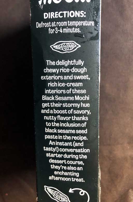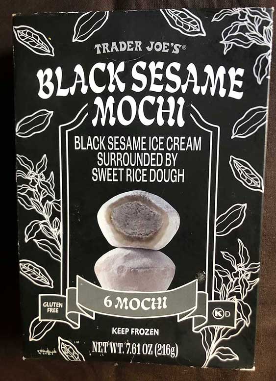 “Our supplier infuses an ice-cream base of milk, cream, and cane sugar with a paste made from roasted, finely-ground Black Sesame seeds. This paste not only lends a rich gray-black hue, but also brings that characteristic nuttiness with a hint of savory to contrast with the flavor of the frozen sweet-cream. Surrounded by a rice-dough wrapper which has also been given the Black Sesame- seed treatment, the resulting couple-bite-sized frozen treat is intriguingly tasty, and an instant conversation starter during your dinner-party dessert course.” – Trader Joe’s