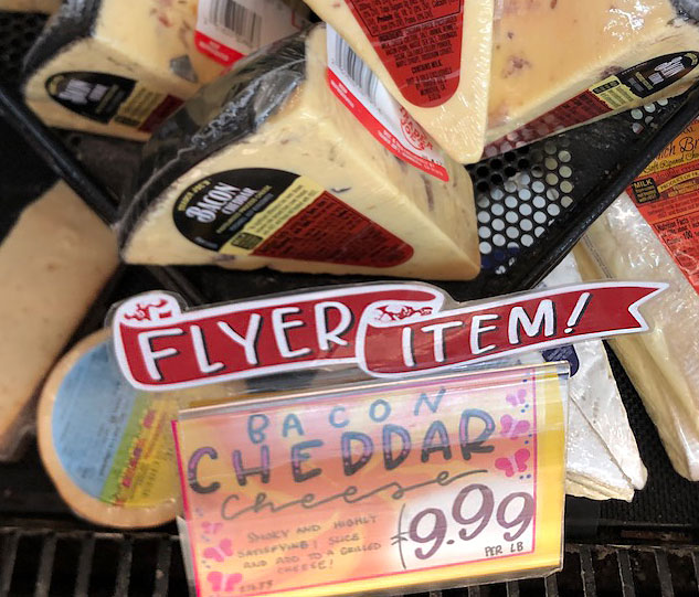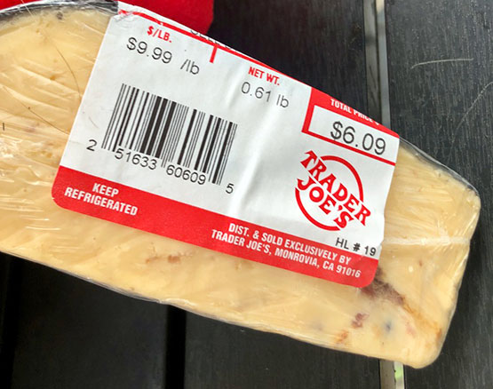 “Trader Joe’s Bacon Cheddar Cheese is handcrafted for us in upstate New York by a master cheesemaker with extensive experience in traditional European Cheddaring techniques and an instinct for blending. Aged for 18 months, the Cheddar is full flavored and mildly sharp with firm, smooth texture….merged with pieces of our very own Trader Joe’s Uncured Applewood Smoked Bacon, which contribute richly savory, sweet-smoky character to every bite. From snacking on while watching a game, to serving as part of a charcuterie board…..baked potatoes, French fries, burgers, broccoli, apple slices, macaroni, biscuits, quiche… ” (from the TJ Fearless Flyer Aug 2025)