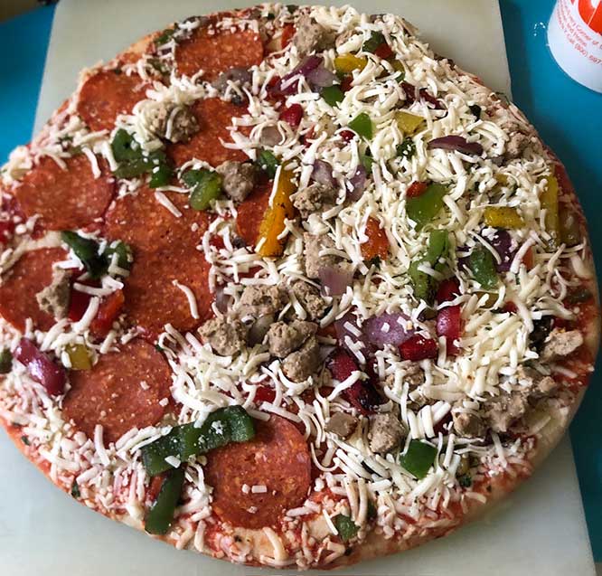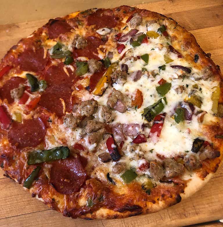 “First, there’s that its stone baked, with a wheat flour crust, which our supplier imports all the way from Italy. Next, there’s the impressive array of toppings piled high on every pie: zesty tomato sauce; a savory trio of mozzarella, Parmesan, and Romano cheeses; sweet roasted bell peppers and onions; savory crumbles of Italian sausage; and finally, delightfully spicy slices of uncured pepperoni.”
