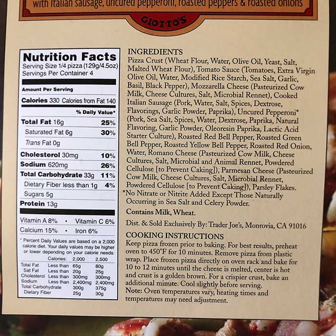 Toppings: Italian sausage, uncured pepperoni, roasted bell peppers, and roasted onions. Crust: Stone-baked wheat flour crust. Sauce: A savory sauce, described as not spicy or sweet. Cheeses: Mozzarella, Parmesan, and Romano. Customer Favorite: A popular item at Trader Joe’s, often praised for its flavor and topping variety.
