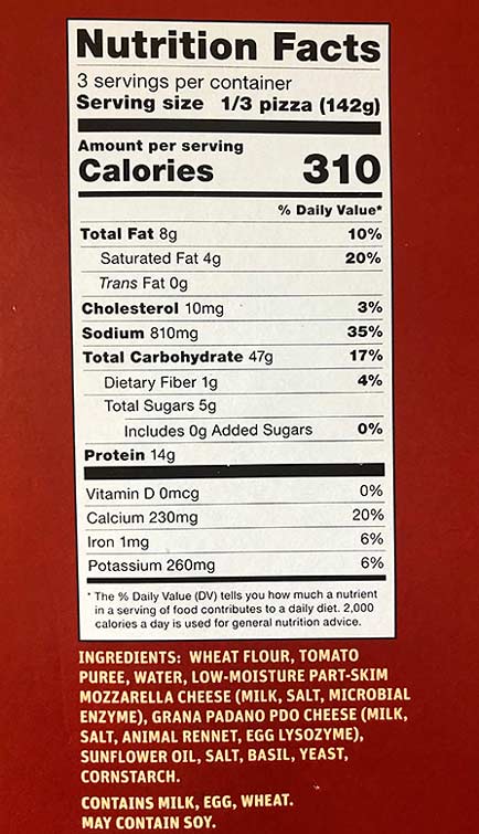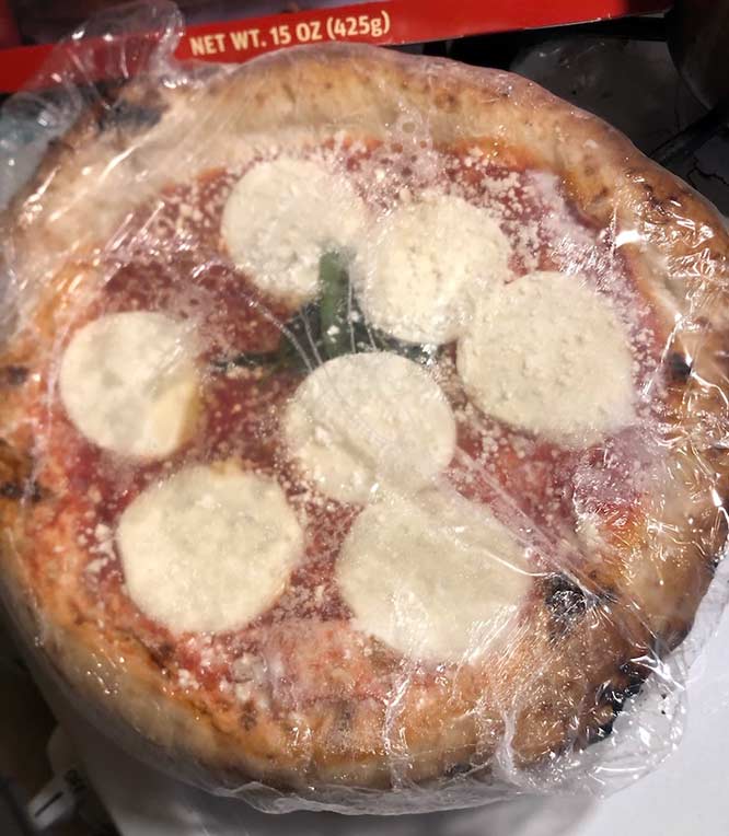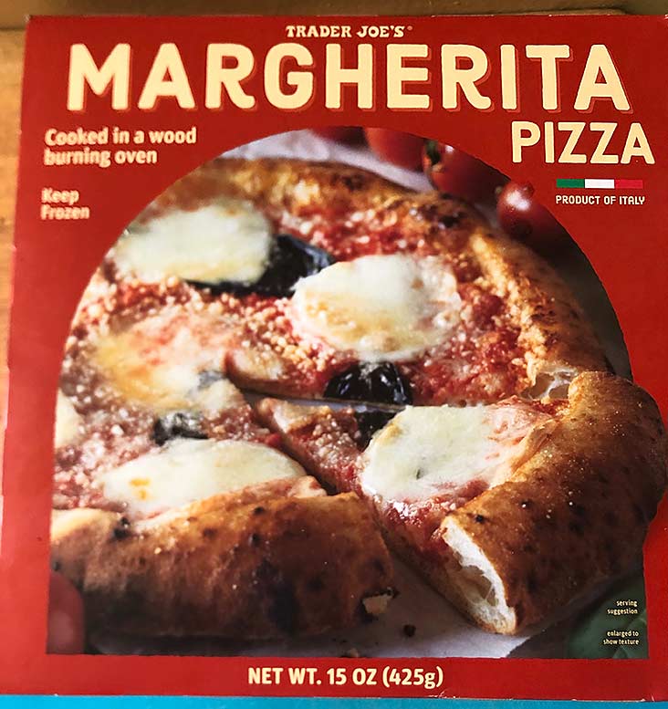 Perhaps the first thing that will stand out to you when you are looking in the pizza shelves at Trader Joe’s and you see this MARGHERITA PIZZA is frankly that this looks pretty good and then you see that it costs $4.79. Under five bucks for this? It’s looks like it almost came out of a pizza place’s oven.