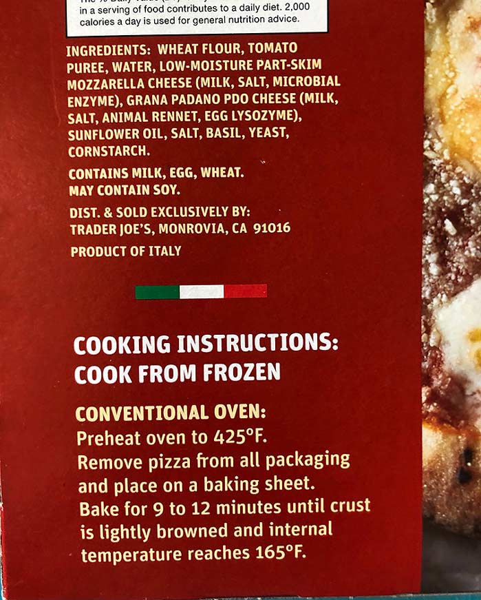“This classic Margherita Pizza starts with a hand-stretched, Amalfi style crust, the dough for which is fermented for a full 24 hours prior to kicking off the pizza-making process. This new-and-much-improved crust is thin, soft, and bubbly, with a slightly thicker, chewy edge. In this Pizza’s previous iteration, they topped said crust with a standard tomato sauce; in this version, however, they top it with a passata—a.k.a. a traditional Italian tomato sauce made by sieving ripe tomatoes into a silky-smooth purée, allowing the pure, tomato flavor to really shine. The pies are finished with fresh mozzarella rounds, shredded Grana Padano and carefully placed basil leaves, then baked in wood-burning stone ovens, flash-frozen, and sent to sail the culinary seas…” (-Trader Joe’s website)