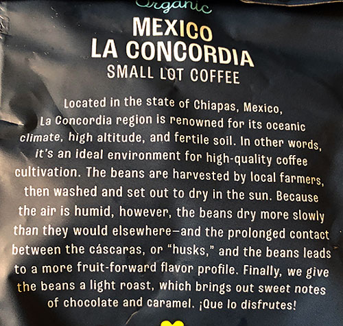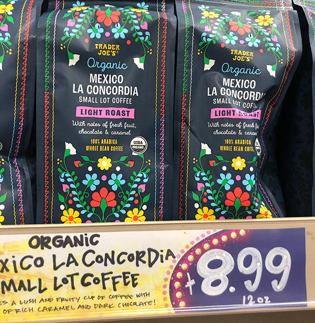 “The newest addition to our Small Lot Coffee program, we’re making a return to Chiapas, a state in southern Mexico. This time, we’ve sourced our coffee from a group of growers within the La Concordia region of Chiapas, where the high elevation and oceanic micro-climate create optimum conditions for growing rich, chocolatey, full-flavored coffees. True to form, each sip of Trader Joe’s La Concordia Mexico Small Lot Coffee is indeed remarkably rich, deliciously chocolatey, and fabulously full-flavored, with notes of sticky caramel and fresh berries throughout.”