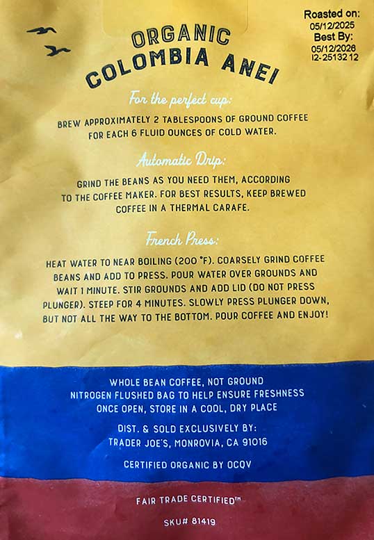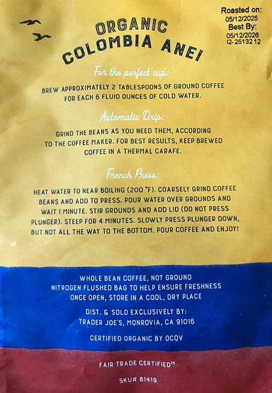 One of our readers, commented that, “it’s divine” and I agree. This small lot coffee is right up there with the very best of all those Trader Joe’s has come out with. Sure, I think they had a few clunkers here and there, but the coffee finders at Trader Joe’s who travel the world looking for good coffee made by small producers, have from time to time, brought back some really excellent finds over the years to us coffee lovers, and this is one of them.