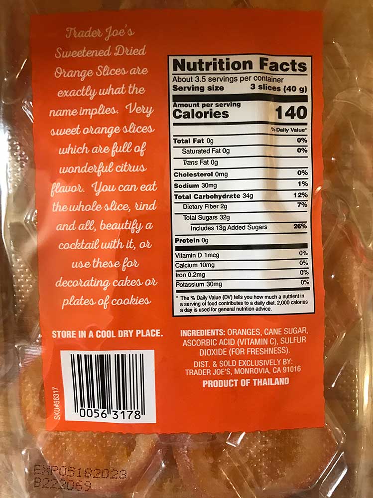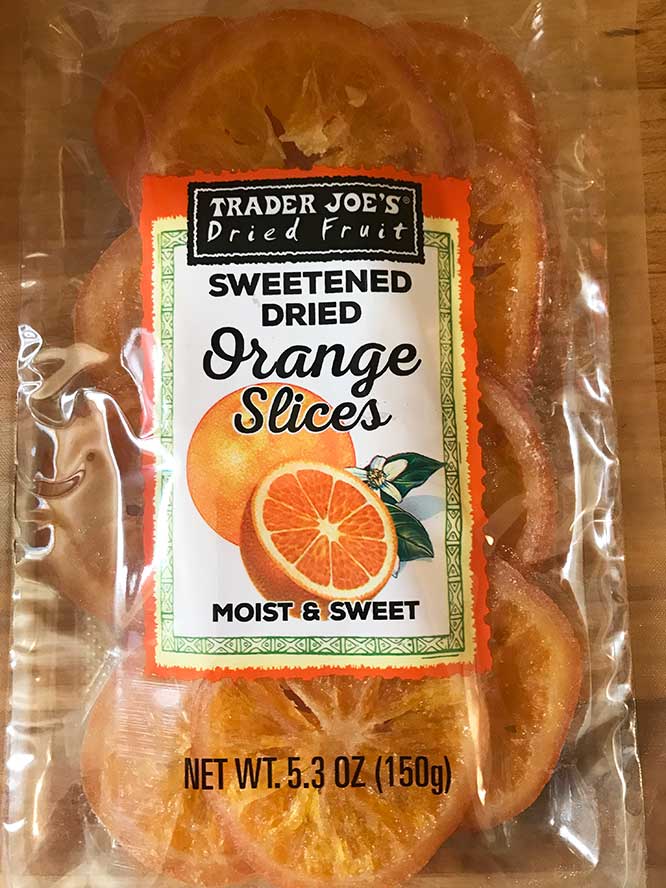 I just love these. They are whole slices of orange including the rind and the peel which are sweetened and dried enough to be slightly chewy. They have a wonderfully intense orange flavor which includes just the slightest bitterness from the peel. These are so good I could eat the whole package at once but I usually stop myself at around 3 slices. OK maybe 4.