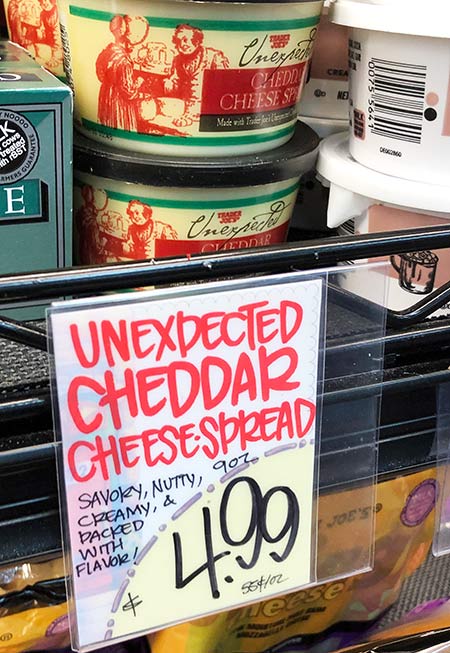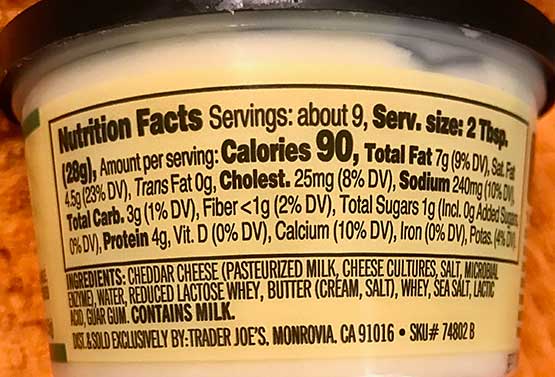 They took TJ’s incredibly popular Unexpected Cheddar cheese and made it into a spread like a pub cheese by adding things like butter and whey to make that hard cheese now spreadable. What a great idea, no?