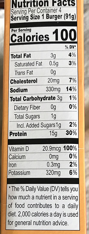 For a short while, Trader Joe’s was carrying fresh Salmon Burgers in the fresh fish section of the refrigerated case. Unfortunately for one reason or another they must have been discontinued these and TJ’s no longer sells fresh salmon burgers – which were pretty good. However TJ’s does carry a frozen version, “Premium Salmon Burgers”. Because these have a lot more ingredients listed than the fresh version had, I was a bit reluctant to try these but I finally did and found them to be actually a bit better than I had expected. At first, I tried cooking them defrosted (which the package says not do!) and I found out why. Defrosted they are so soft you can’t even get them out of the plastic wrapping without falling apart as you do it. Therefore I cooked them again, this time from frozen as the package states. Of course the salmon burger was much easier to handle when it was a frozen hockey puck. Interestingly I found the results cooking them frozen or defrosted came out about the same. I grilled the frozen salmon burgers, using the pan fry skillet method, as per the package cooking them for about 3-4 minutes per side in a little oil and butter. They were pretty tasty. We ate them on a brioche bun with lettuce, tomato and tartar sauce. On the plus side, the Sodium level listed is not terribly high which is good. I would buy these again. They’re $6.99 for a 12.8 oz package which contains 4 salmon burgers.