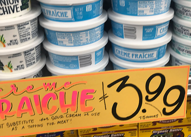 New at Trader Joe’s: Creme Fraiche is kind of the French version of sour cream. However its a bit different, and better that sour cream as it has more butterfat plus is a bit more tangy. This is the first time I’ve seen creme fraiche at Trader Joe’s. This is a welcome addition to the dairy stuff. Lots of ways to use it. Use it in cooking. Also fabulous au naturel topped with berries and a little sprinkle of coconut sugar.