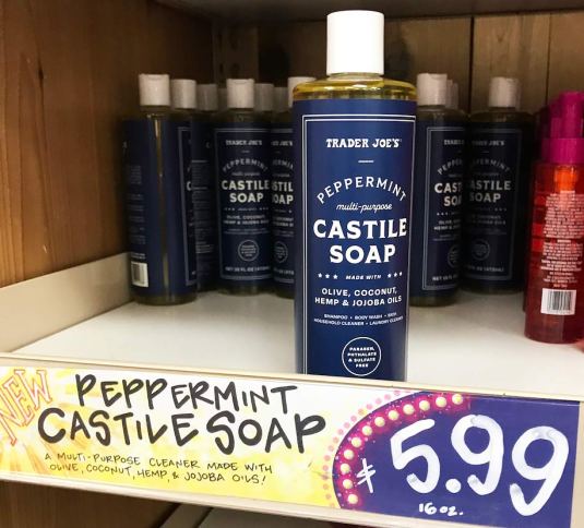 Trader Joe’s CASTILE PEPPERMINT SOAP is $5.99 for a 16 oz bottle. For comparison Target sells Dr. Bronner’s Castile Soap for $17 for a 32 oz bottle. So decent price for this quality Castile soap.