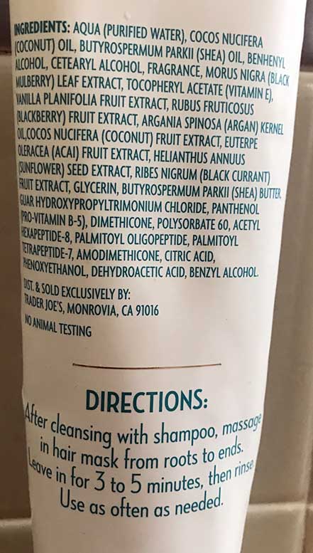 I find this to be an terrific conditioner for your hair. Well, Trader Joe’s calls this a “mask”. I call it an intensive conditioner, that really works to make your hair softer and silkier.It has a lovely smell as well. If you read the ingredients listed one can see it has a lot of moisturizing oils and other ingredients. These include coconut oil, shea butter oil, mulberry leaf extract, vitamin E, argan oil, coconut extract, açai extract, sunflower seed extract, and vitamin B5. You just put it on and leave it in for 3 to 5 minutes, then rinse. I even sometimes put a tiny dab of it on my wet (curly) hair after getting out of the shower like a hair dressing. I would call this a premium product but it doesn’t have a premium price, due to it’s own brand label and no marketing. Its a super reasonable $3.99 for the 5 oz tube. A real bargain. If you try this stuff I bet you will find it works well and thank me (a guy no less) for the tip!