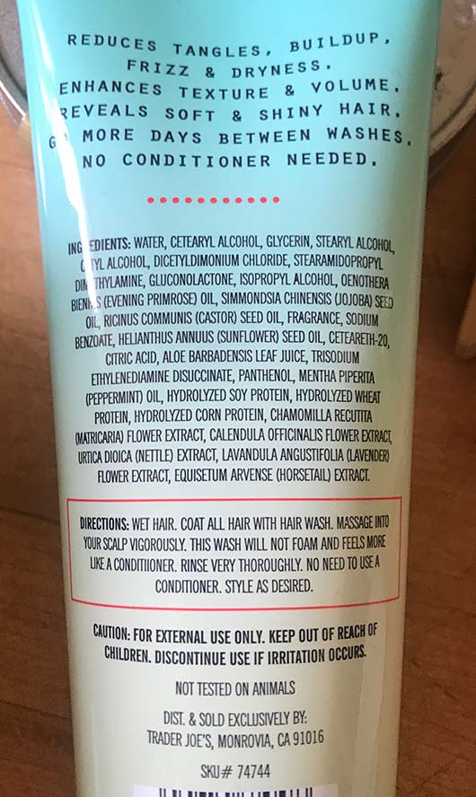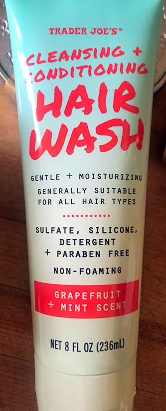 NEW ITEM: Trader Joe’s “Cleansing and Conditioning Hair Wash” – “Gentle + Moisturizing. Generally Suitable For all hair types. Detergent & Paraben Free. Non-Foaming. Grapefruit Mint Scent. Reduces tangles, buildup, frizz and dryness. Enhances texture and volume. Reveals soft and shiny hair. Get more days between washes. No conditioner needed”