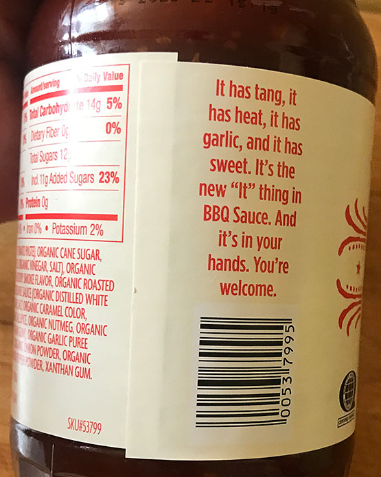 There is a little heat in this tomato based Organic BBQ sauce and for me the level is just right as well as the the little sweetness balancing out the heat. It’s spicyness would be from the organic red jalapeno pepper puree they use, and the Sweet would be from organic molasses. It has a little bit of hickory smoke flavor but not too much. Reading the label you see things like allspice, clove and habanero. So some complex flavors going on there. To me, everything is perfectly balanced to make a very tangy, tasty BBQ sauce. I really love this stuff. I think this is absolutely perfect for grilled chicken – or grilled tofu for that matter. Put it on at the end for a glaze. It was perfect to make the Pulled Jackfruit Sliders on Aloha Buns (see link below for recipe)