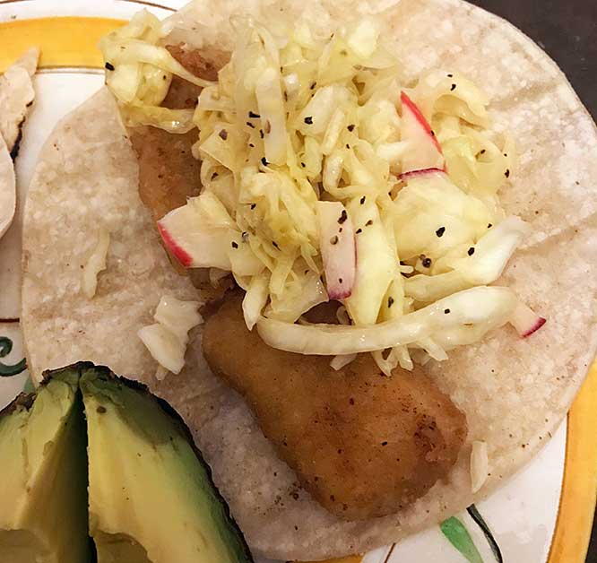 Add yogurt and lime juice to the slaw mix; let sit a 1/2 hour to marinate. Cook up the fish till golden brown and put two pieces into a warm corn tortilla and top with slaw and a few drops of salsa or hot sauce.