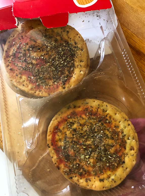 The cute, little round “pizza crackers” do pretty much resemble a little pizza. They’re both cute and tasty! The baked crackers have tomato sauce and quite a bit of oregano. Look. Little crunchy pizzas, people…