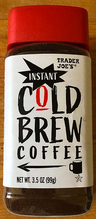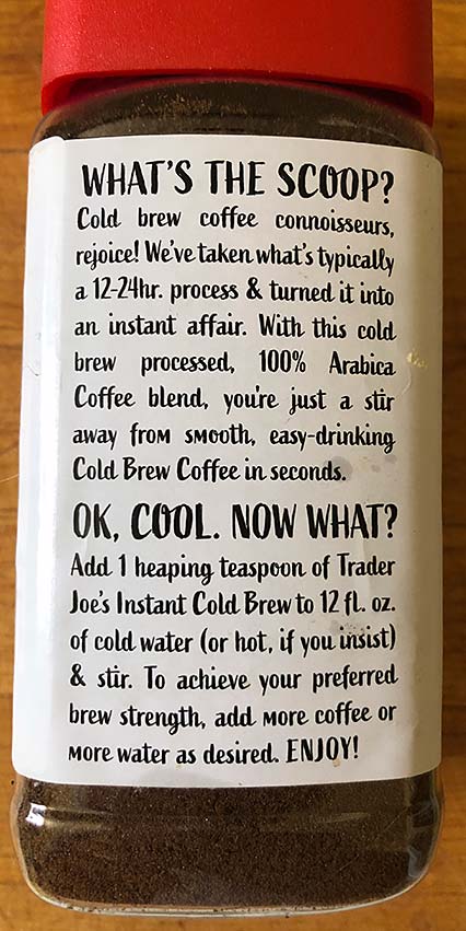 Trader Joe’s says: “Trader Joe’s Instant Cold Brew Coffee starts with 100% Arabica coffee beans from India. Our supplier uses an all-natural, proprietary extraction method that took them over two years to develop. It’s truly a unique process that yields a fine, dark powder. Add one heaping teaspoon of this Instant Cold Brew Coffee to 12 fluid ounces of cold or hot water, then stir until dissolved. The result is a cup of Cold Brew that’s full-bodied, dark, and smooth, with a caramel-like aroma and rich, cold-brew coffee taste.”