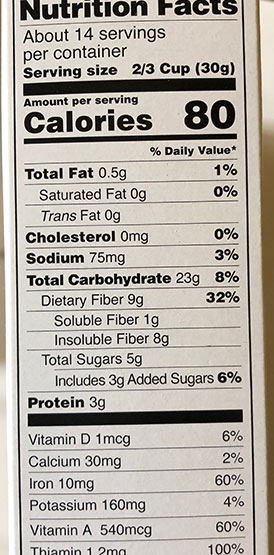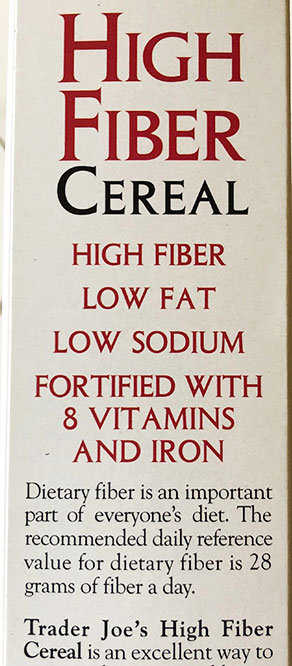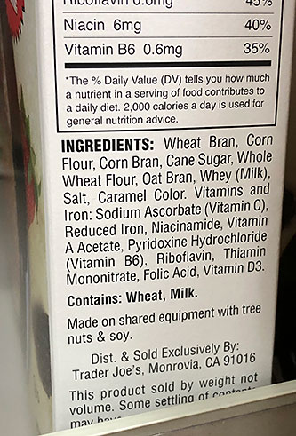 Also in the plus column is it’s low in calories, very low in fat, is low in sodium, has zerocholesterol, PLUS this cereal is low in Added Sugars, compared to almost any other cereal Trader Joe’s sells. So really compared to many others, this is a “healthy choice” in the Trader Joe’s cereal department. Maybe the healthiest cereal they sell?