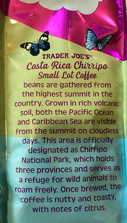 I liked it but it didn’t knock me out as some of their other small lot coffee finds have at times in the past. These are totally hit or miss. Sometimes you get one which is fantastic. Outstanding. Sometimes you get one which is pretty good, which for me, is this Costa Rican coffee. I thought it was pretty good. I only say this as some of the Trader Joe’s coffees which were terrific raise the bar when compared to some of the best Small Lot coffee finds in the past over the years that TJ’s has had. The Uganda Mountains of The Moon small lot coffee from a while back was off the hook, stunning. Epic! So again, there is a high bar.