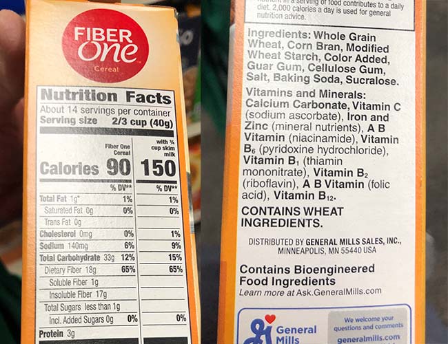 Ingredients: wheat bran, corn flour, corn bran, cane sugar, whole wheat, oat bran, and fortified with vitamins plus iron (60% of the DVI for Iron).