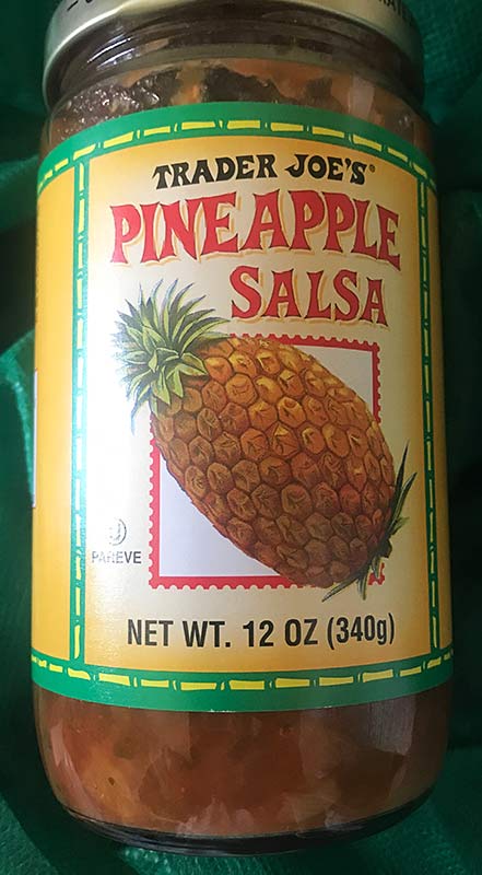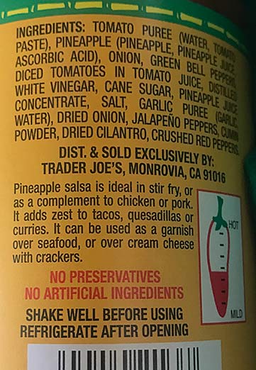 I wasn’t sure I was going to like this but I was actually pleasantly surprised at how much I did like it when I tasted it and how good this salsa really was. I think the name put me off. Actually it’s quite good and I think if most people try this, they will like it too. Even though pineapple is in the name and is listed as the second ingredient on the list of ingredients, it doesn’t stand out and taste “pineapple-y” or overly sweet; it is completely blended into the other flavors. It does have a hint of sweetness but it tastes like salsa, not pineapples. I have a feeling this is salsa that even people who don’t like salsa will like! You know the “I don’t like salsa; its too spicy for me” type. As you can see from the “heat scale” on the label this is a fairly mild salsa with only a small amount of spiciness. Now as pork and pineapple are a famous match (eg, tacos al pastor) I would try TJ’s Pineapple Salsa on top of some Carnitas tacos. It would be great also on nachos, rice, shrimp, salmon, eggs, or anything you can think of. You could brush this on at the end of grilling / broiling chicken and it would great. A 12 oz jar is $1.99, so at under two dollars this is one of the cheaper salsas on offer at Trader Joe’s. I would gladly buy this again. Ingredients: Tomato, Pineapple, Onion, Green Pepper, Vinegar, Cane Sugar, Salt, Garlic, Jalapeno, Cilantro, Red Pepper