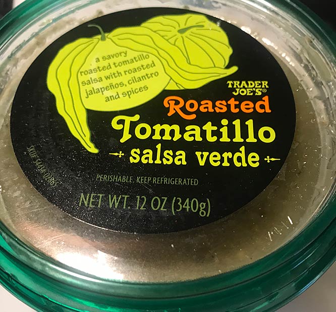 You will find Trader Joe’s FRESH SALSA VERDE in the refrigerated section, and it’s quite good. If you are just used to tomato based (red) salsas and you want to try something a little bit different for your Mexican dishes, a Salsa Verde like this is a great variation to try out. This salsa is made primarily from roasted tomatillos. Tomatillo based green salsas are very typical in Mexico, and frequently one will find both a red and green salsa next to each other for the diner to choose from. Though they slightly resemble a green tomato, in fact tomatillos are at best distant cousins to tomatoes. The tomatillo is a unique green fruit native to Mexico which were around for a thousand years or more way before the tomato was even brought by the Spanish Conquistadors (after 1500). Tomatillos are covered with papery skins, which is also pretty unique.