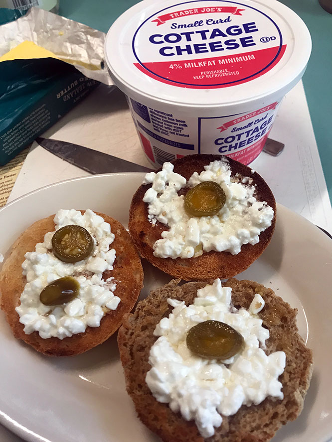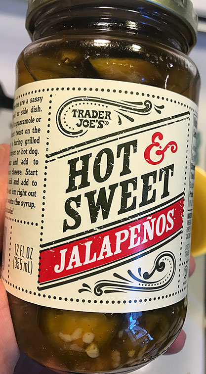 OMG, these are SO blody good! Another simply brilliant condiment from TJ’s something Trader Joe’s seems especially good at coming up with. Slices of picked jalapeños sweetened with organic cane sugar added to make them Hot & Sweet which makes for an even improved version over TJ’s regular pickled jalapeños (also excellent). First off yes these are SPICY HOT ! Hotter than the regular TJ pickled jalapeños. There are whole dried red chilis in the jar plus it says pureed jalapeños also to ramp up the heat level. We just adore these. We put them on so many things. My wife and I dream up new ideas for things to put these on. Last night we put them on top of grilled hamburgers (on toasted brioche bread). Ok this is a no-brainer and of course they were freakin’ delicious on hamburgers… or hot dogs or sausages or sandwiches. For breakfast this morning I put a few slices of these hot and sweet babies on my toasted bagel with cottage cheese. They went perfectly with the mellow cottage cheese to spice up something that otherwise would be pretty boring, so these are a Great Combo.