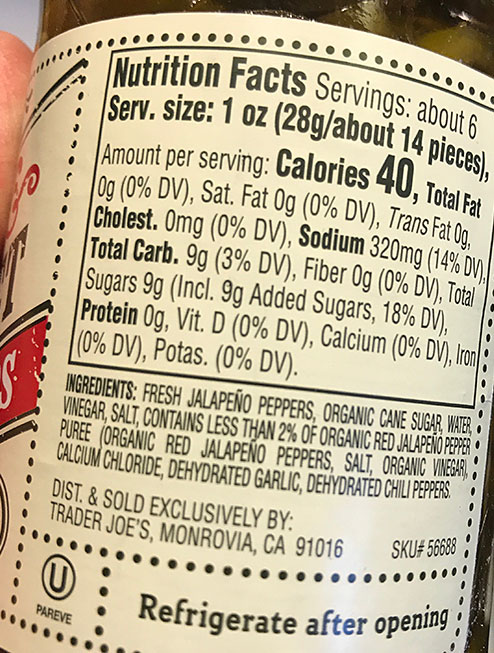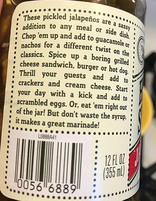 The bottle has good suggestions on the label, such as add them chopped up to your guacamole. For that matter add some chopped up on top of your avocado toast! Grilled cheese? Oh yes, these go perfectly put some in with the cheese before you grill them so they mix into that melted cheese (chopped or whole if you want big spicy bites). Scrambled eggs? Oh yes, again delicious. Ditto with cream cheese and crackers. Brilliant. Especially with the Red Chili Crackers. For nachos? Another no-brainer. Finally do not ignore TJ’s suggestion about not wasting that leftover juice in the bottle for using in marinades. This hot and spicy pickle juice is amazing. I keep of bottle of just that in the fridge.